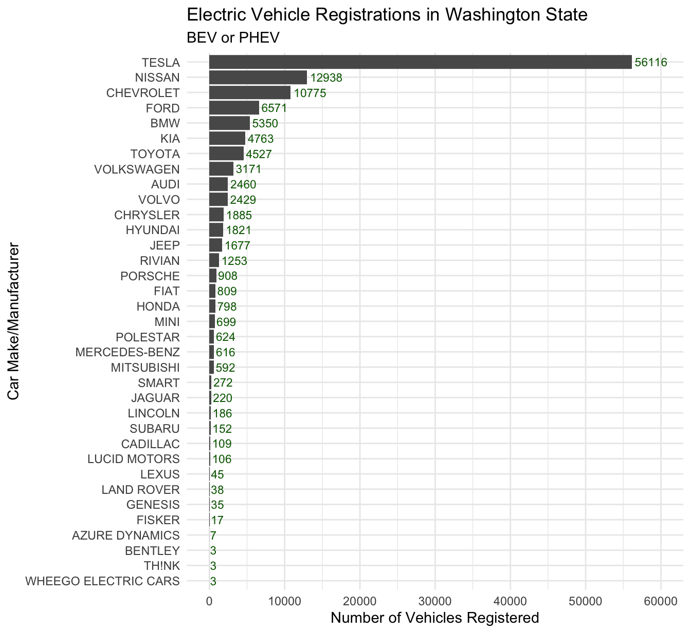 electric_vehicle_population |>ggplot(aes(x =fct_rev(fct_infreq(make)))) +geom_bar() +geom_text(aes(label =after_stat(count)), stat ="count", hjust =-0.1, size =3, colour ="dark green") +coord_flip() +scale_y_continuous(breaks =seq(0, 60000, 10000), limits =c(0, 60000)) +xlab("Car Make/Manufacturer") +ylab("Number of Vehicles Registered") +labs(title ="Electric Vehicle Registrations in Washington State",subtitle ="BEV or PHEV") +theme_minimal()