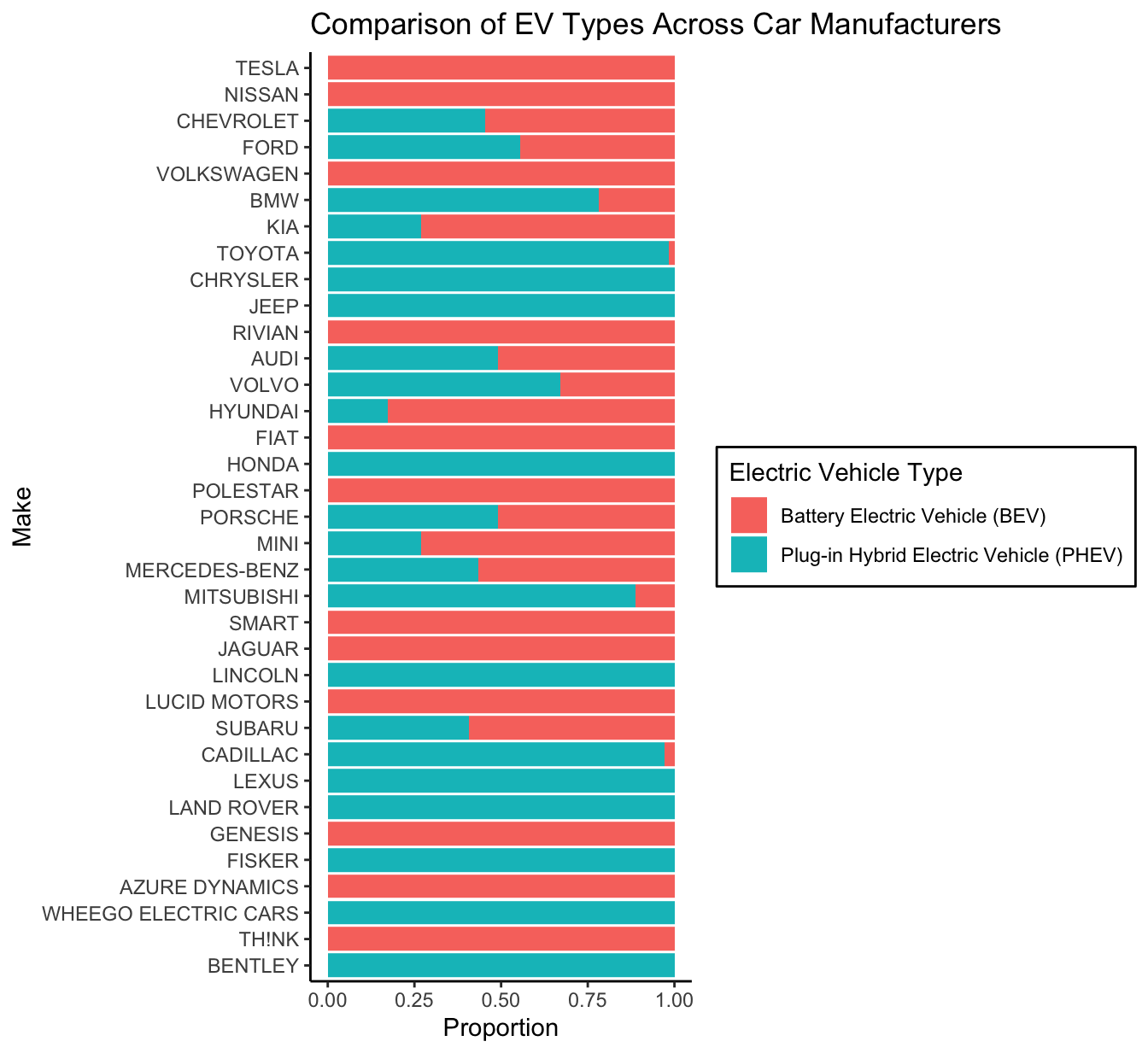electric_vehicle_population |>group_by(make, electric_vehicle_type) |>summarize(number_of_vehicles_registered =n(), .groups ="drop") |>ggplot(mapping =aes(x =reorder(make,number_of_vehicles_registered), y = number_of_vehicles_registered, fill = electric_vehicle_type)) +geom_bar(stat ="identity", position ="fill") +coord_flip() +labs(title ="Comparison of EV Types Across Car Manufacturers") +ylab("Proportion") +xlab("Make") +theme_classic() +theme(legend.background =element_rect(color ="black")) +guides(fill =guide_legend("Electric Vehicle Type"))