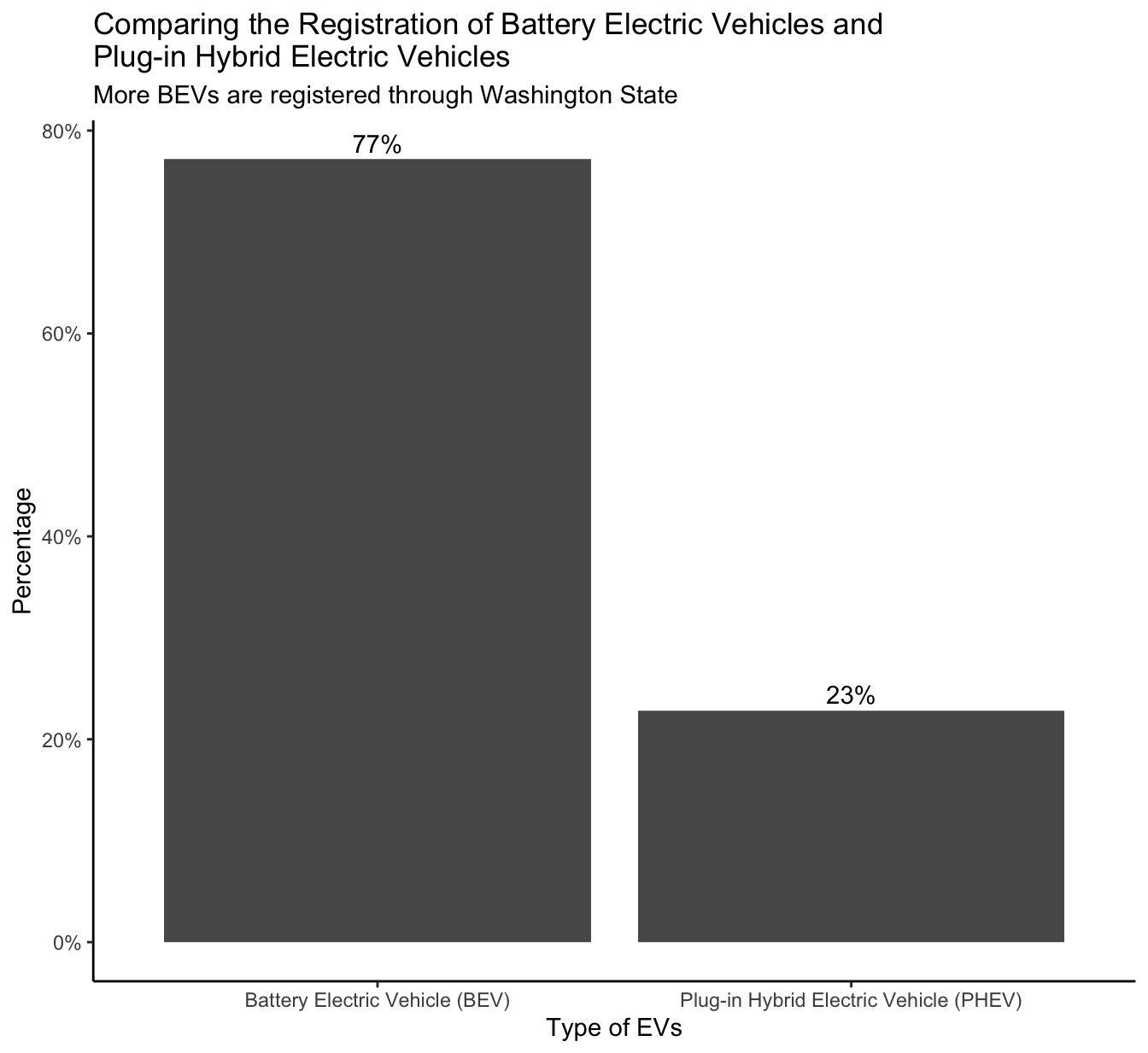 electric_vehicle_population |>group_by(electric_vehicle_type) |>summarize(number_of_vehicles_registered =n()) |>mutate(percentage = (number_of_vehicles_registered/sum(number_of_vehicles_registered))) |>ggplot(mapping =aes(x =reorder(electric_vehicle_type,-percentage), y = percentage)) +geom_bar(stat ="identity") +geom_text(aes(label = scales::percent(round(percentage, digits =4)), vjust =-.4)) +scale_y_continuous(labels = scales::percent) +xlab("Type of EVs") +ylab("Percentage") +labs(title ="Comparing the Registration of Battery Electric Vehicles and\nPlug-in Hybrid Electric Vehicles",subtitle ="More BEVs are registered through Washington State ") +theme_classic() +xlab("Type of EVs") +ylab("Percentage")
