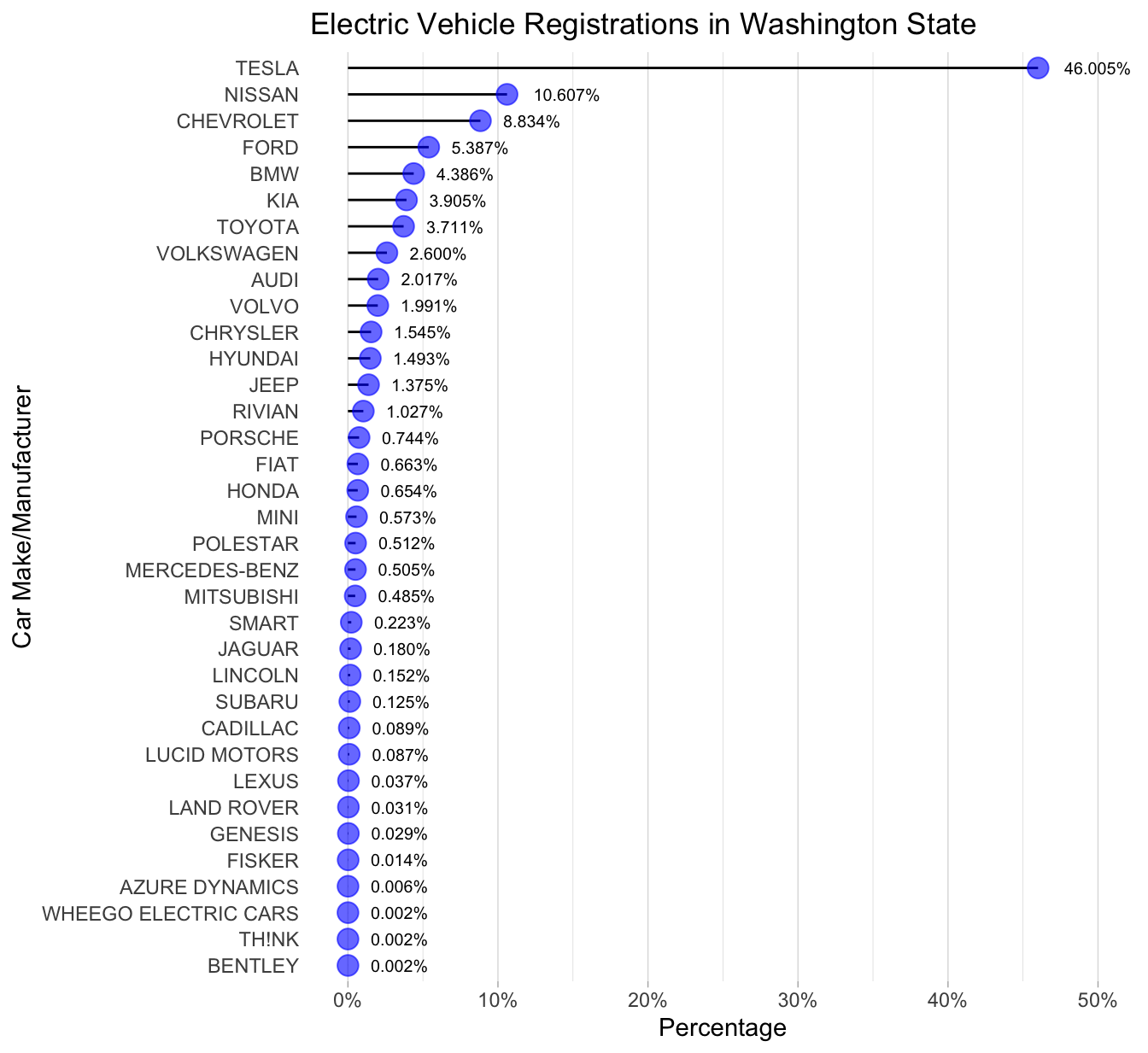 According to data from the Washington State Department of Licensing, Tesla boasts the highest proportion of registered electric vehicles (EVs) among all car companies, with a substantial percentage of 46%. This signifies Tesla’s notable market share and strong presence in the EV sector within Washington State, surpassing other car manufacturers in terms of EV registrations.